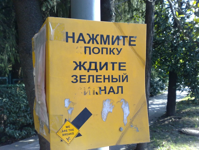 Далее. Уже писал. Переход через Конституции, если идешь со стороны моста через реку в сторону СИБа (или как он там называется, в общем — на противоположной от рынка стороне). Подходишь к переходу. Ищешь глазами кнопку. Фиг: видишь ее только на выходе из подземного перехода. Дорожка из подземки и дорожка от моста даже не соединены между собой. Чтобы нажать на кнопку, ты должен выйти на проезжую часть. Расстояние — то же, что и просто перейти на красный.