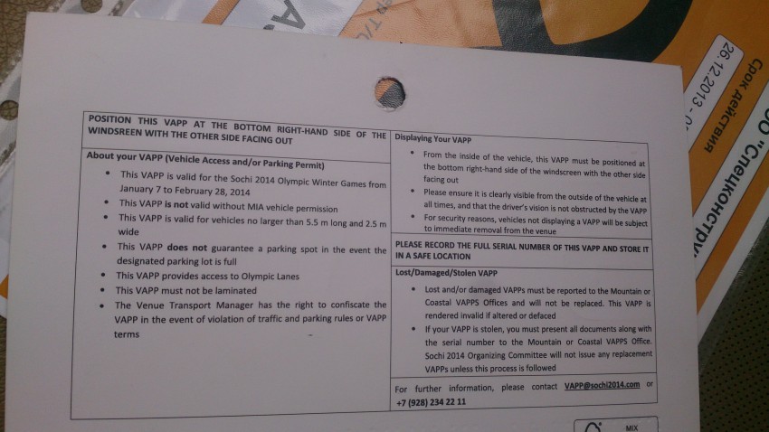 Собственно, вот так и наё… ют нас камеры или те кто это не доглядел, и такое письмо не одно, мало того, что за эти пропуска платились огромные деньги, так еще — будьте добры в ГИБДД пожертвуйте. На всякий случай поясню: для движения по Олимпийским полосам необходимы два документа, это аккредитация для движения по городу во время Олимпиады (на фото правее наклонена, но имеется во всех базах и привязана к номеру авто) и нужен пропуск на стоянки Олимпийских объектов или просто без права стоянки — не столь важно, но это тот, который во всей красе на авто