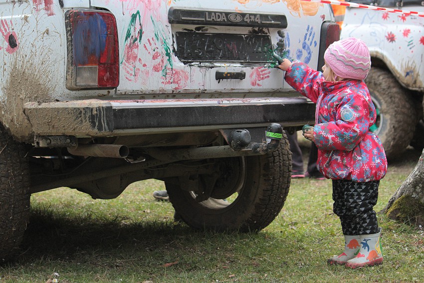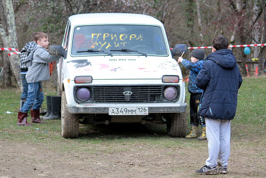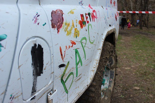 На этом внедорожная часть была закончена, джипинг перешел в шашлыкинг, прекрасный пол отправился пробоваться свои силы в стрельбе и командных конкурсах, а дети — превращать внедорожники в картины.
