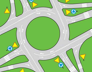 Ну вот Вам тогда для затравки правильное представление кольцевой развязки, а не та чушь, что Вы нарисовали если все спрямлять. А то полезет кто в интернет ПДД учить, а тут такая фигня нарисована. Не могу допустить…