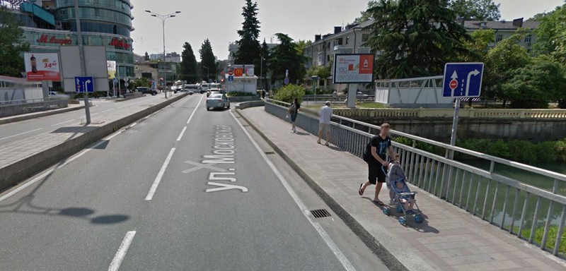 Вначале, видимо где-то здесь, посреди моста, кончается главная дорога и соответствующее движение по полосам: