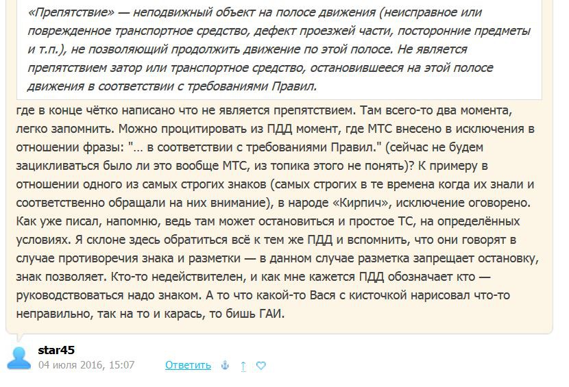 где в конце чётко написано что не является препятствием. Там всего-то два момента, легко запомнить. Можно процитировать из ПДД момент, где МТС внесено в исключения в отношении фразы: "… в соответствии с требованиями Правил." (сейчас не будем зацикливаться было ли это вообще МТС, из топика этого не понять)? К примеру в отношении одного из самых строгих знаков (самых строгих в те времена когда их знали и соответственно обращали на них внимание), в народе «Кирпич», исключение оговорено. Как уже писал, напомню, ведь там может остановиться и простое ТС, на определённых условиях. Я склоне здесь обратиться всё к тем же ПДД и вспомнить, что они говорят в случае противоречия знака и разметки — в данном случае разметка запрещает остановку, знак позволяет. Кто-то недействителен, и как мне кажется ПДД обозначает кто — руководствоваться надо знаком. А то что какой-то Вася с кисточкой нарисовал что-то неправильно, так на то и карась, то бишь ГАИ.