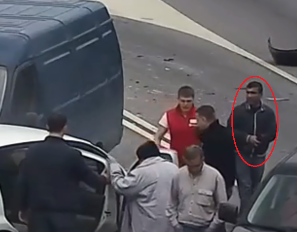 Дальше. 27-я секунда. Отчетливо вижу водителя, который сидит к нам правым боком. В кружке обведены голова, видим воротник и правая рука, которой он хватается за руль, чтобы вылезти из глубины салона