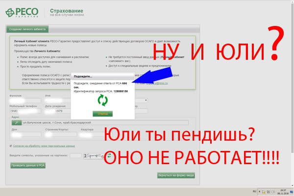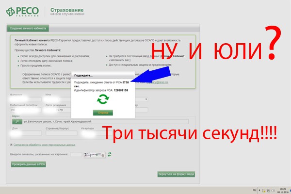 У меня же все получилось, подобное зависание с базой РСА вроде тоже было, но главный квест там впереди называется «угадай какой датой записано водительское в базу РСА(прошлым страховщиком)» не угадал — тупо ошибку выводит и расчет не дает. Главное учтите если проверка пройдет и удастся сохранить расчет, то в дальнейшем вы не сможете внести изменения в полис, только оплатить. и создать(после сохранения) второй уже система не даст. Изза этой хрени я жену не вписал, по её данным не удалось мне угадать что у них там вписано в базе рса(может быть вписано либо 31.12.«год_выдачи_прав», либо реальная дата выдачи прав, либо вообще фиг знает какая дата, зависит от того что вбивали страховщики в базу раньше), попробовал удалить ее все сохранилось и только была возможность оплатить. т.к. заканчивался прошлый полис и совсем не хотелось стоять в очередях пришлось оплачивать так, и на том спасибо. Если продлевать полис то этих проблем, с которыми я столкнулся по идее нет — все данные уже заполнены.