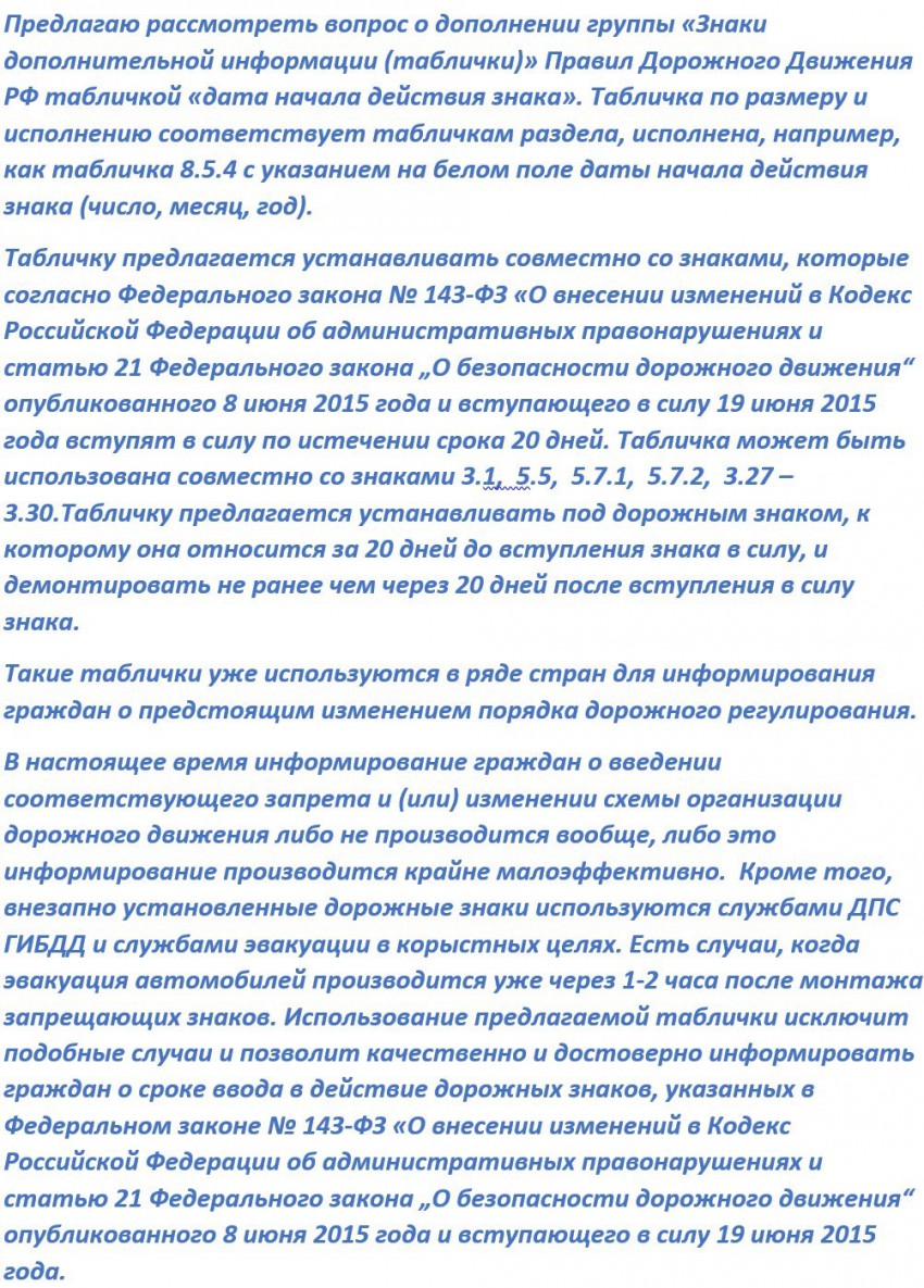 В последнее время приходит много сообщений о том, что, используя дорожные знаки, установленные совсем недавно, службы ДПС и компании по эвакуации автотранспорта активно эвакуируют транспорт с этих мест. Это грубое нарушение Федерального закона № 143-ФЗ «О внесении изменений в Кодекс Российской Федерации об административных правонарушениях и статью 21 Федерального закона „О безопасности дорожного движения“ опубликованного 8 июня 2015 года и вступающего в силу 19 июня 2015 года.