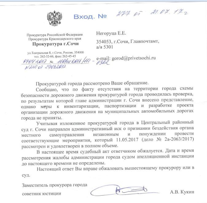 Понимая также, что бороться с каждым знаком в отдельности непродуктивно и затратно по времени, мы стали задавать неудобные вопросы по решению вопроса в принципе. Сначала прокуратуре города, потом — края… Пройдя этот круг (впрочем как и всегда!) по нескольку раз, к марту прокуратура созрела и внесла представление Главе города. Глава должным образом не отреагировал. Понимаю, цена вопроса: 70 миллионов, однако, кто-то заплатил кому-то в 2013году за транспортную схему города, которую мы так и не увидели, очень даже нехилую сумму. Хотя могли бы направить эти средства на реально нужное для горожан дело. Недавно мы в очередной раз побеспокоили прокуратуру города с просьбой проинформировать нас как идут дела… Вот, получили ответ…