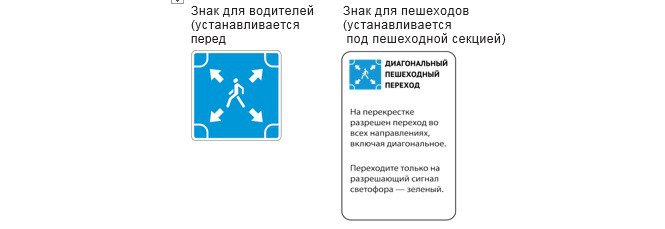 Вводится новый дорожных знак 5.19.3 — диагональный пешеходный переход, для обозначения перекрестков, на которых разрешен переход пешеходов по диагонали