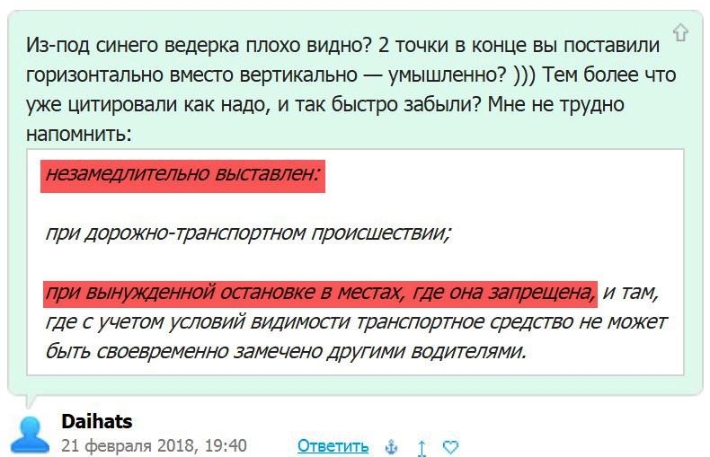 Вы же кастрировали текст ПДД, изменив их смысл: вместо двоеточия поставили… две точки, отрезали пару конкретизирующих абзацев. А теперь с упёрством твердите, что при остановке с аварийкой надо еще и знак выставить.Надо не всегда, а вот юлите вы всегда! Так что это