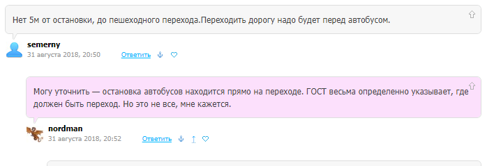 Нив одном комментарии нет и намека на обоснования своего мнения, не находите? Вот, хотя бы :«Отсюда — переход должен быть до остановки, а не перед ней или на ней, как на фото.» А почему до остановки? Одит скажет «ДО», другой — «ПОСЛЕ». Гарантия, что один из них прав.