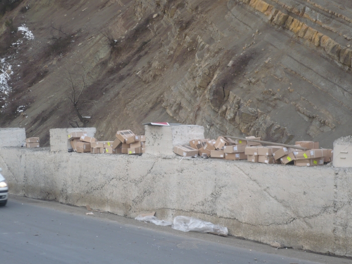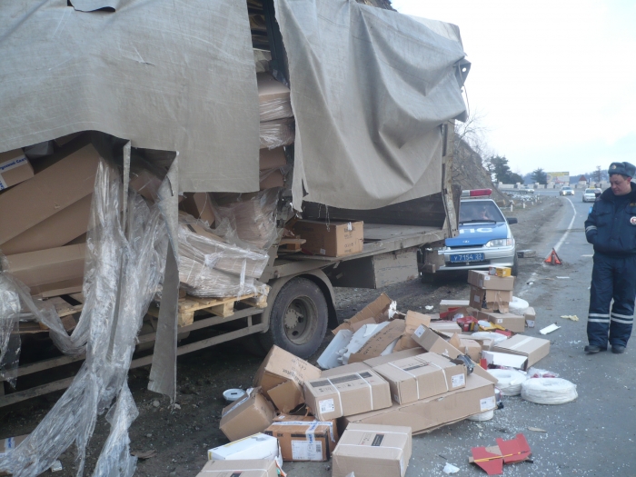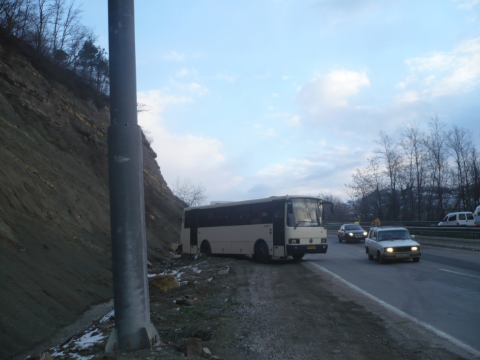 Сегодня, при спуске с Мамайского перевала, примерно в 6-30 утра, попал в аварию МАЗ с номерами ростовского региона (161), груженый электроборудованием. По предварительным данным, у него либо отказали тормоза, либо — это результат невнимательности водителя. Дорога была сухая. Машина сначала ударилась об отбойник последнего, самого коварного поворота перед постом ГИБДД, а потом уже врезалась в стоящий на обочине пустой, неисправный, рейсовый автобус 125 маршрута.