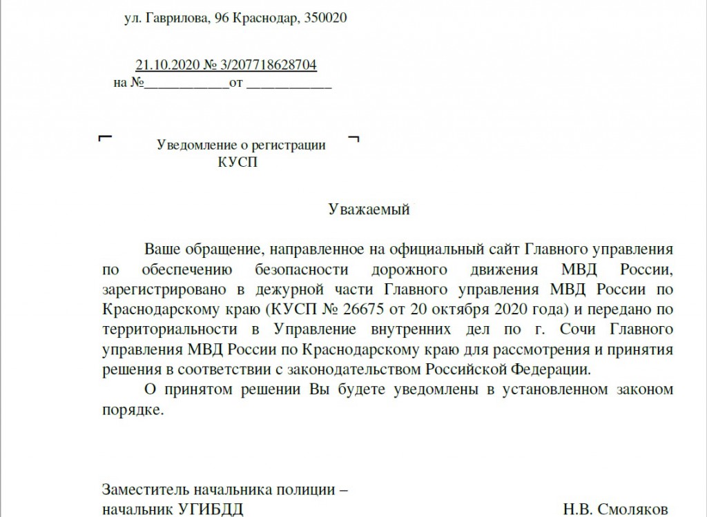 Такое обстоятельство есть причина для ст.12.33 КОАП РФ. 15.10.2020 обращаюсь в МВД по Краснодарскому краю для привлечения виновных к ответственности за это злостное нарушения ЗАКОНА РФ. 20.10.2020 без проблем получаю КУСП, в котором говорится, что моё обращение направляется в ДПС Сочи(. Жду установленный законом срок, за который «отважные, храбрые, ответственные, честные, добросовестные» сотрудники МВД города Сочи должны разобраться со злостным нарушителем закона. Но срок прошёл, а это значит, что «отважные, храбрые, ответственные, честные, добросовестные» сотрудники МВД города Сочи нарушили ФЗ-№59. 25.11.2020 настало время обратится, к тому-самому нарушителю ст.12.33 КОАП РФ на нарушителя ФЗ-№59. 27.11.2020 я получаю ответ от нарушителя ФЗ-№59. В ответе нарушитель ФЗ-№ 59 не видит посторонние предметы на проезжай части.