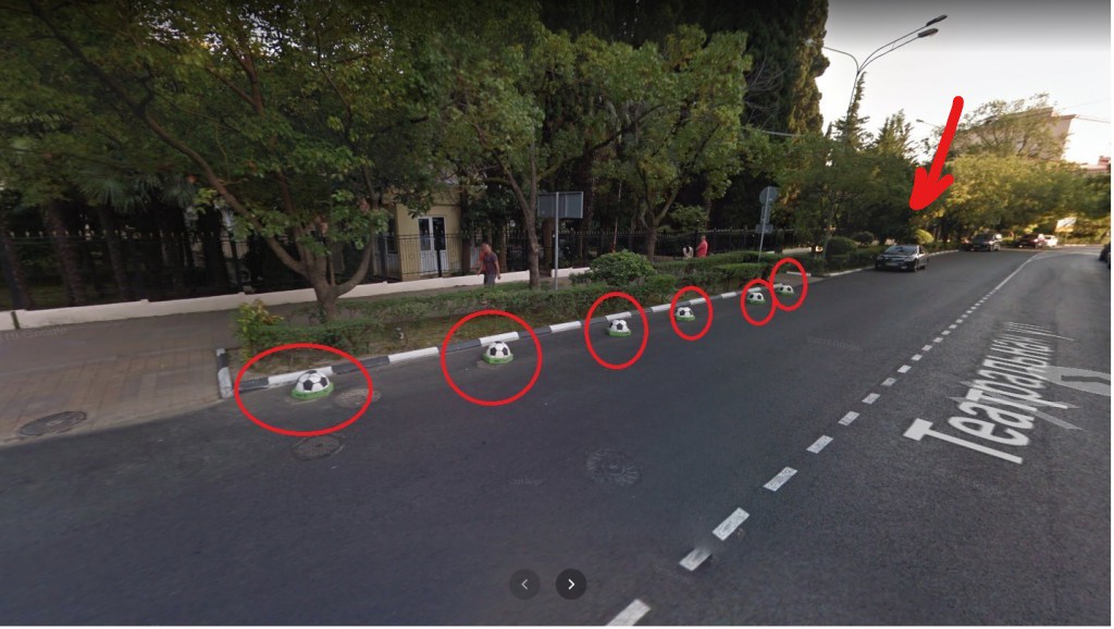 Итак: город сочи, улица Театральная 8(ну вы знаете, что там), на проезжай части установлены посторонние предметы в виде бетонных, полусферические изделий, разукрашенные под футбольный мяч.