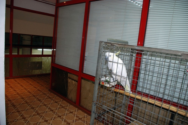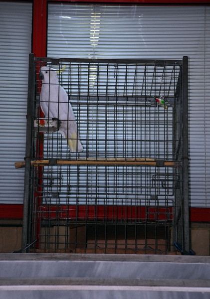 Не удивлюсь, если у продавцов к концу рабочего дня от этого крика голова раскалывается… да и покупатели пугаются… а если у кого-то плохо с сердцем? кроме того, содержать такую птицу в Такой клетке… и в таком месте — издевательство…