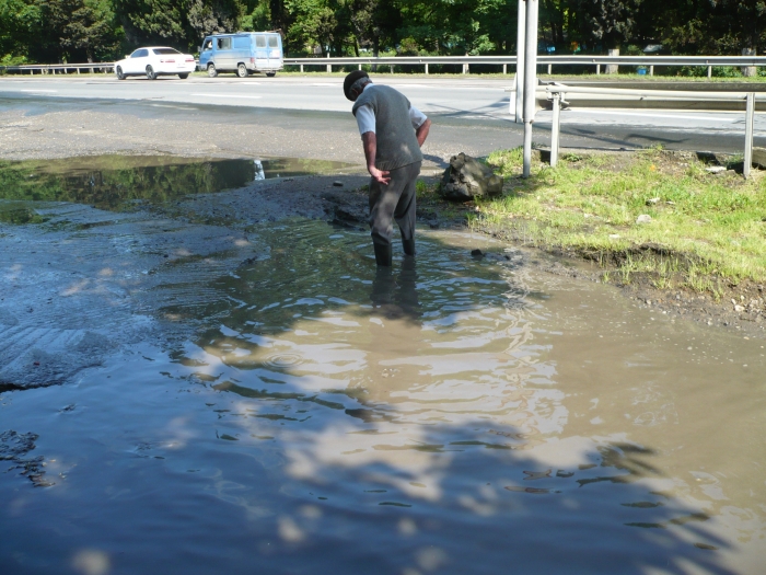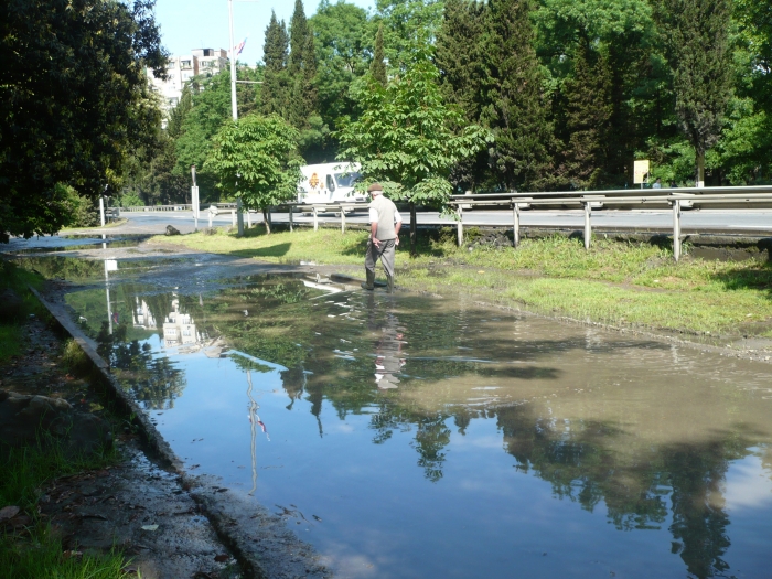Сегодня утром была гроза и самый настоящий тропический ливень… Нужно было срочно ехать в Дагомыс, часам к 9-00 разъяснило — выглянуло солнышко. Центральная улица Дагомыса — Батумское шоссе ( дорога, расположенная параллельно к федеральной трассе и ведущая к жилым домам и учреждениям) представляла собой вот такую картину
