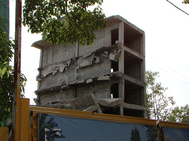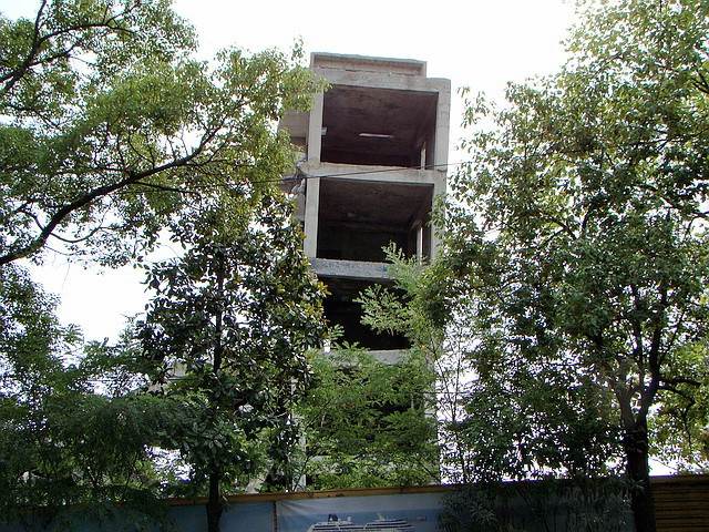Каким то образом земля, где раньше располагалась бильярдная, перешла в другие руки и/или для других целей. Для каких — непонятно, но очевидно, что цель была направлена на извлечение максимальной прибыли. Начали строить, подняли несколько этажей, уж точно не помню сколько. И тут понеслось: сперва здание покосилось (и кто бы что не говорил — уверен, это вина не строителей, а тех, кто дал разрешение строить на опасном оползневом участке). Застройщика это не сильно смутило, видимо, так как здание вскоре выпрямляли донкратами, забивали новые сваи, проводили укрепительные работы (данные работы являются очень дорогостоящими). Начали строить дальше. Дальше — больше. Здание «упорно гнет свою линию».