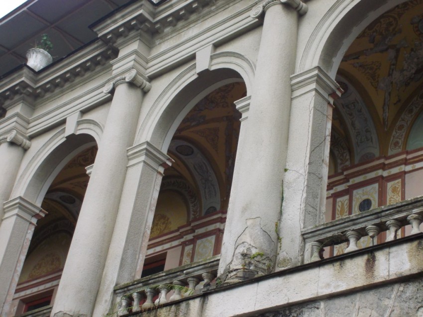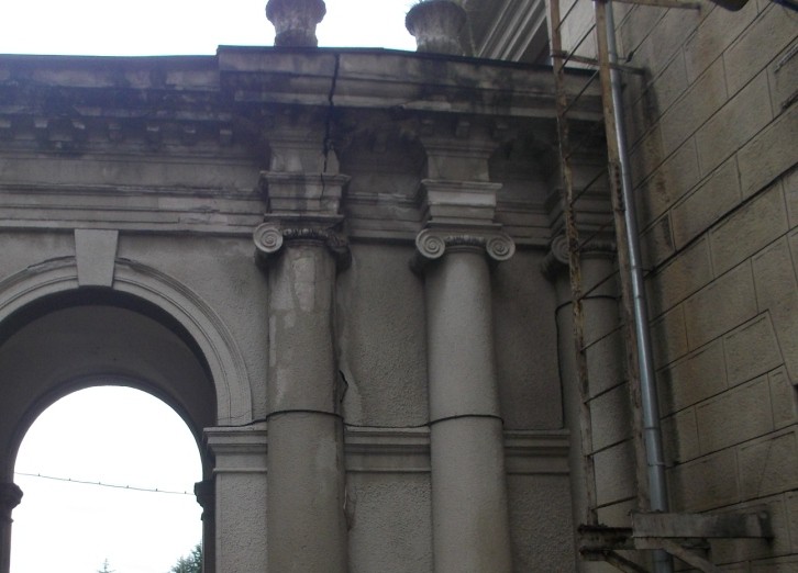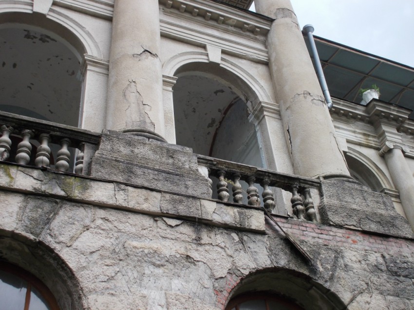 Арки. Стянуты металлическими листами. Обвалились завитки колонн. Расползаются трещины.
