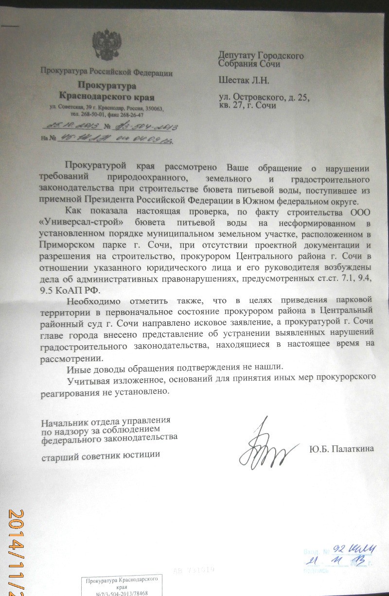 Тем не менее повода для радости как у горожан, так и у местной власти не имеется. Буквально сегодня депутат Городского Собрания Сочи Шестак Л.Н. получила официальный ответ из прокуратуры Краснодарского края: