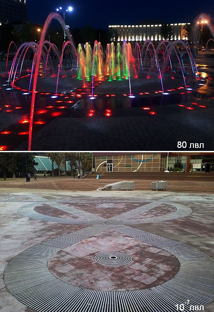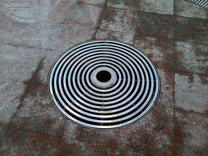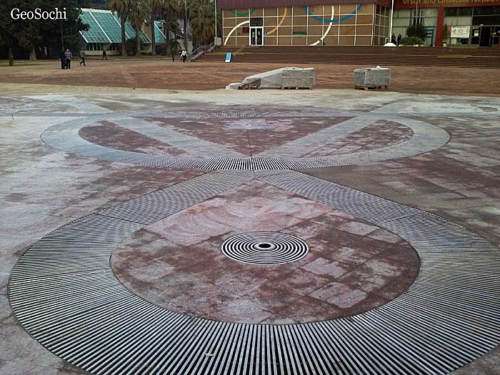 По факту у нас все гораздо скромнее. Фонтан сделан вровень с площадью и прикрыт декоративными решеточками. В центре решеток отверстия из них, по идее, в небо должны бить струи воды. Снаружи выглядит правдоподобно.