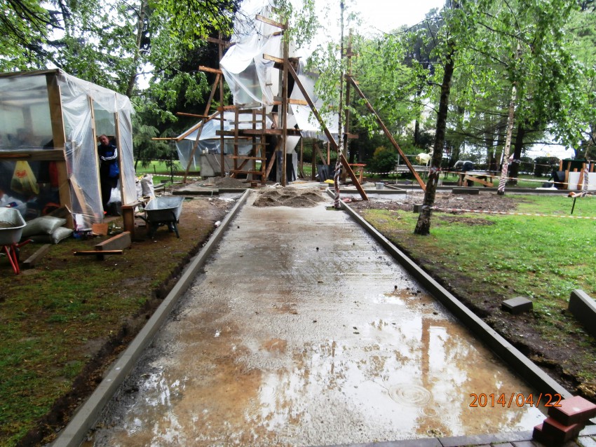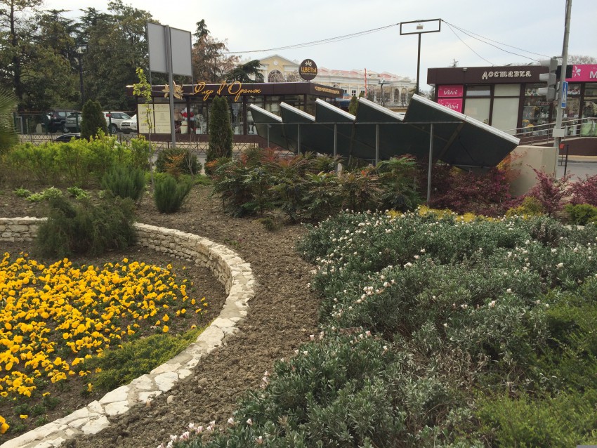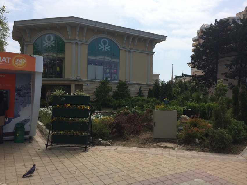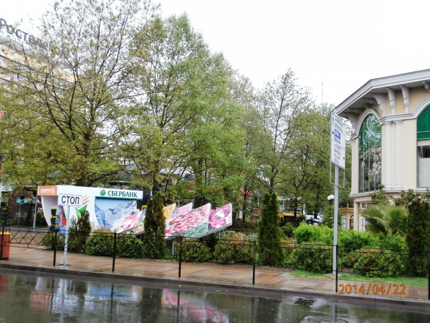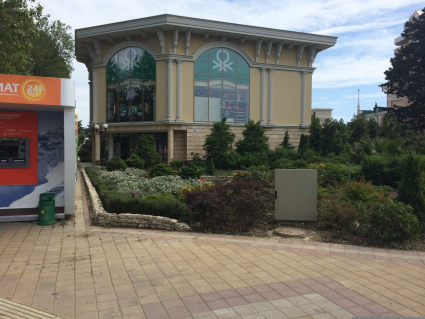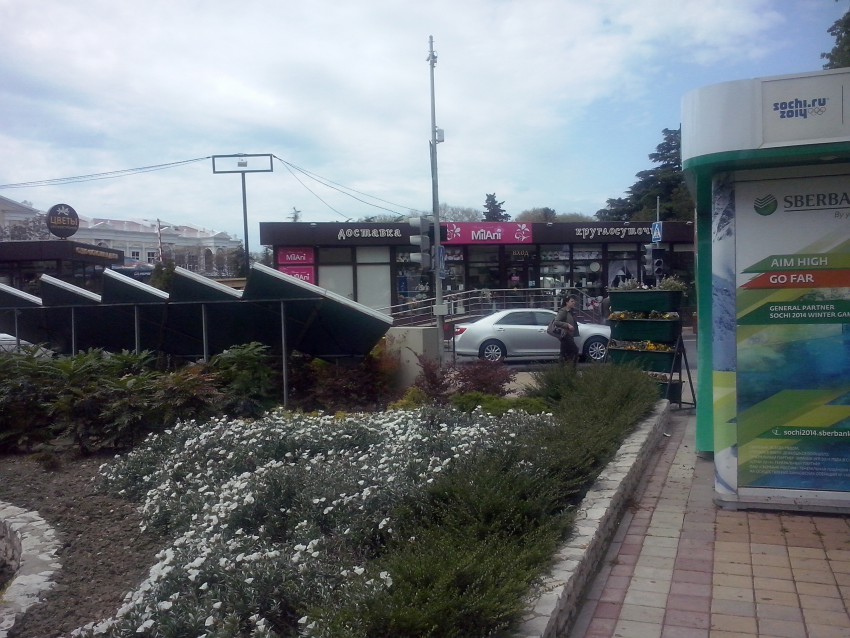 Ну вот, теперь уже и в порядок привели, уход постоянный обеспечили. Но нет, администрации скучно, нужно покреативить. Перед Олимпиадой это место заставили переносными клумбами ( ДЛЯ ЧЕГО??? они там нужны...), подсветками и в довершение — мобильным киоском Сбербанка…