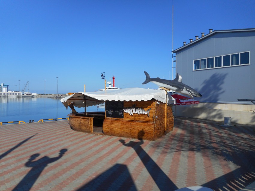 Деревянный ларёк, каким-то покосившимся выглядит, хотя новый. Если это стиль такой, то не соответствует окружающей обстановке (его как буд-то ветром принесло с рыбацкой деревушки)