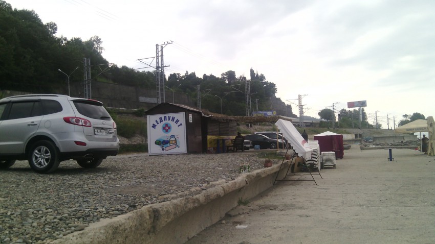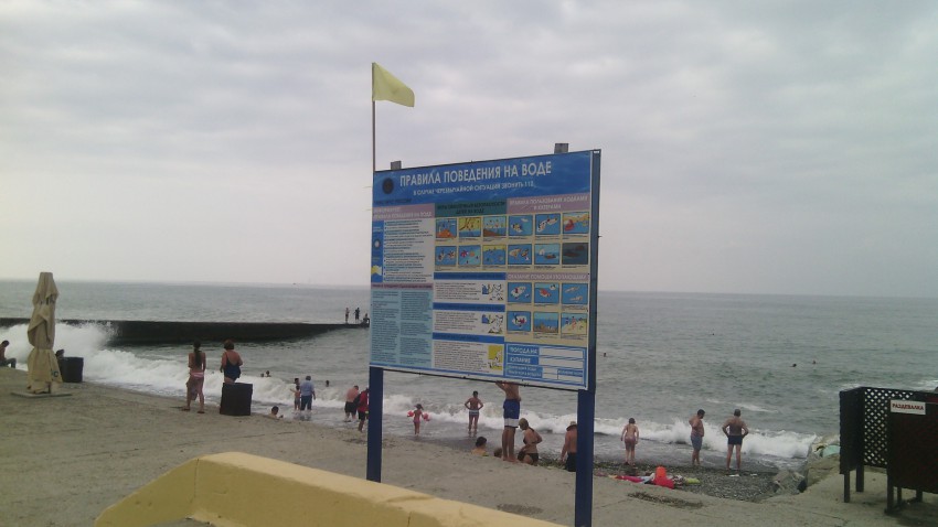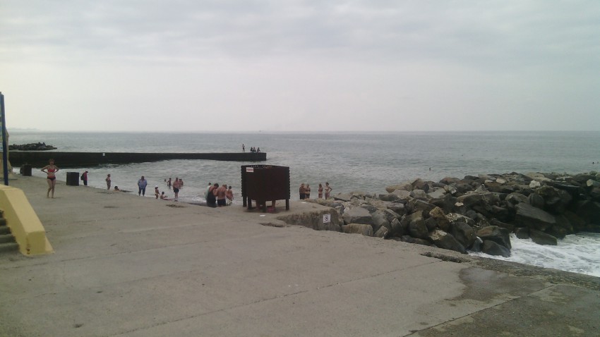 Ну, и прочие красоты пляжа. В целом — неплохое местечко, и речка там почти без сбросов впадает. Мы обычно левее купаемся — там тетраподы и народа нет почти.