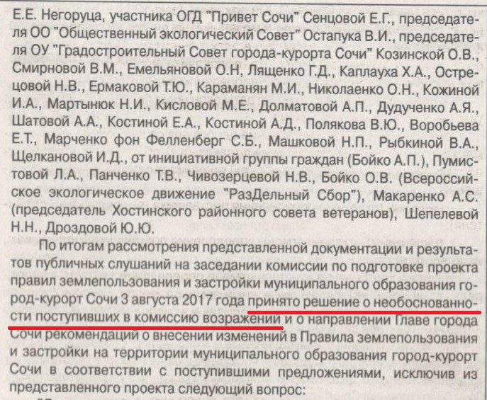 И вот в газете «Новости Сочи» №117-118 от 16.08.2017г опубликовано долгожданное заключение по результатам публичных слушаний № 16ИП33-1 от 03.08.2017г. Сказать — шок? Нет… Это слово сюда не походит. Эти, с позволения сказать «специалисты» нагло плюнули в лицо всем жителям нашего города, которым не всё равно что с этим городом творят временщики. Не вдаваясь в подробности, чохом, ВСЕ ЗАМЕЧАНИЯ И ПРЕДЛОЖЕНИЯ ПРИЗНАНЫ НЕОБОСНОВАННЫМИ!!!!!!!