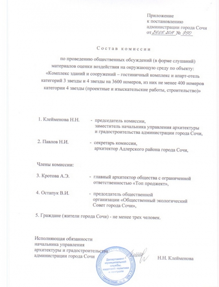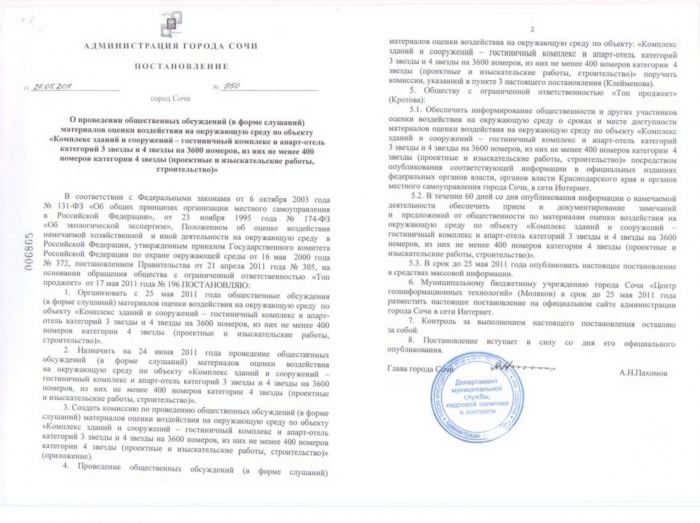 На сайте администрации опубликовано очередное постановление администрации города Сочи от 24.05.2011 г. № 950 «О проведении общественных обсуждений (в форме слушаний) материалов оценки воздействия на окружающую среду по объекту „Комплекс заданий и сооружений — гостиничный комплекс и апарт-отель категорий 3 звезды и 4 звезды на 3600 номеров, из них не менее 400 номеров категории 4 звезды (проектные и изыскательные, строительство)“