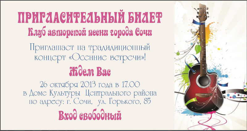 26 октября 2013 года, г. Сочи, Дом Культуры Центрального района. Состоится концерт сочинского клуба авторской песни «Осенние встречи».