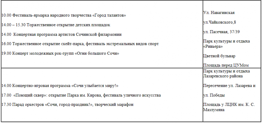 Не хочется казаться нудным и придирчивым. Но…раз уж управление культуры приложилось к информированию населения о праздниках, оно должно, обязано излучать образованность и тщательно проверять грамотность текстов. Фраза «Сочи — мы любим тебя» безграмотна. Сочи, (обращение выделяется запятой, а не тире) мы любим тебя. А вот «Сочи, город-праздник» следует писать «Сочи — город-праздник». Ну, а что касается города-праздника по сути… город вымирает после 21. Мрачная пустыня. Самое время ностальгировать по советским временам, когда было, куда пойти, и было зачем
