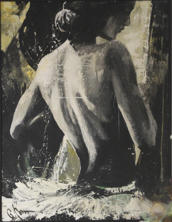 В прямоугольник холста вписан торс. Крутой изгиб спины, сильные мышцы — формула идеального, прекрасного, образ человеческого совершенства… Но это ли содержание картины? Над сюжетом доминирует художественный прием. Краска ложится широко и свободно, стекает каплями, оставляя легкие наплывы, рассыпается брызгами. Прекрасная женщина или безликий фон, ей, краске, всё равно, она царственно небрежна везде и во всём. Она – истинная героиня произведения, ею надо любоваться, ее любить!