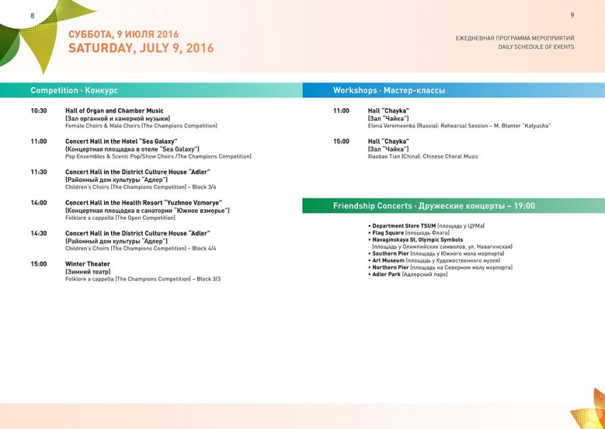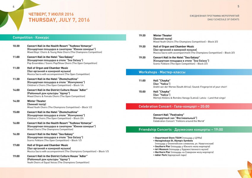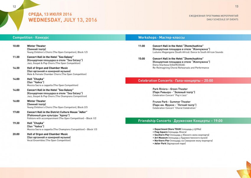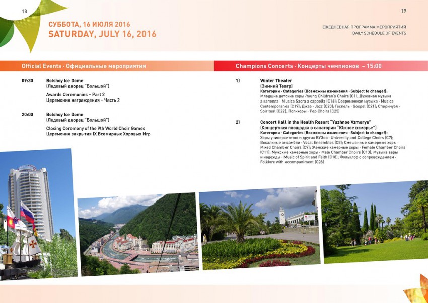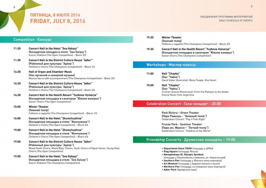 С 6 по 16 июля 2016 года на лучших концертных площадках города Сочи будут соревноваться 283 хора из 36 стран мира: 119 российских коллективов — более 3 000 участников и 164 иностранных — более 9 000 участников. Среди них хор инвалидов из Армении, коллектив глухих вокалистов из Китая. Есть и хор слепых исполнителей.
