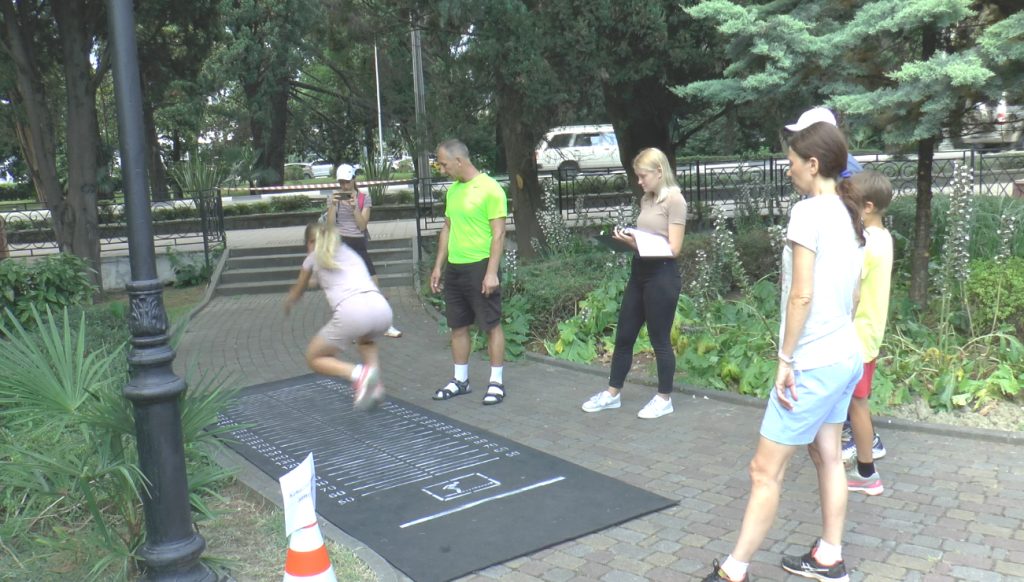 На площади Октябрьского сквера у красивейшего фонтана уже во всю развернулись спортивные соревнования в рубрике «Папа, мама, я – спортивная семья».