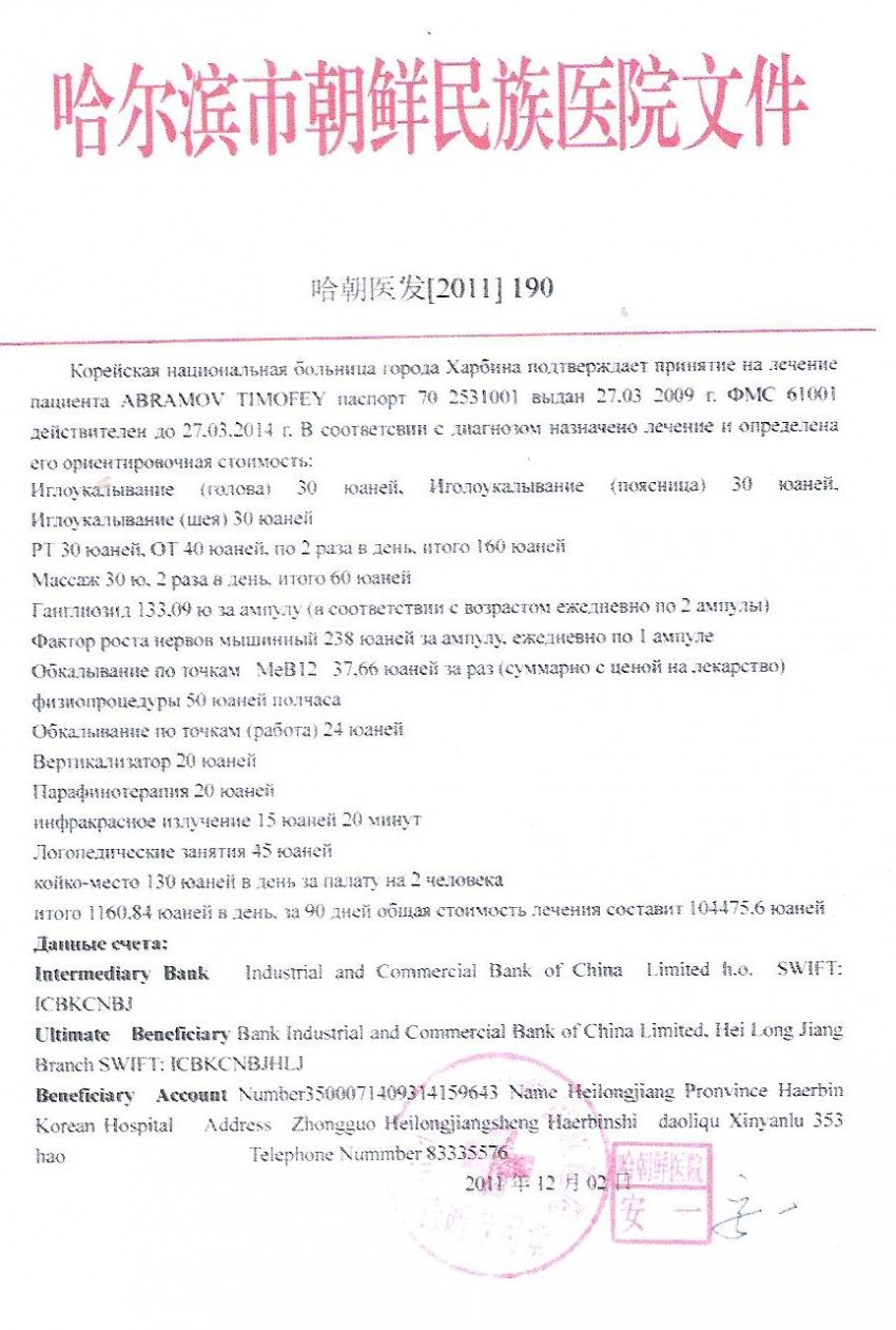 Почти полтора года Тимоша с мамой провели в Поднебесной. Огромный успех достигнут в реабилитации ребенка. Если раньше он не мог даже самостоятельно откусывать и пережевывать пищу, то теперь повторяет все слова, отвечает на вопросы. Нет сомнения в полной сохранности интеллекта! Осталось добиться перелома в физическом состоянии ребенка, что бы он смог научиться самостоятельно ходить. Помочь в этом взялись специалисты одной из ведущих клиник Харбина, но счет, который выставлен за трех месячный курс реабилитации, семье самостоятельно никак не потянуть. 104475 юаней, это 522375 рублей. Помимо оплаты счета за лечение, необходимо оплатить авиа- перелет, визы и страховку.