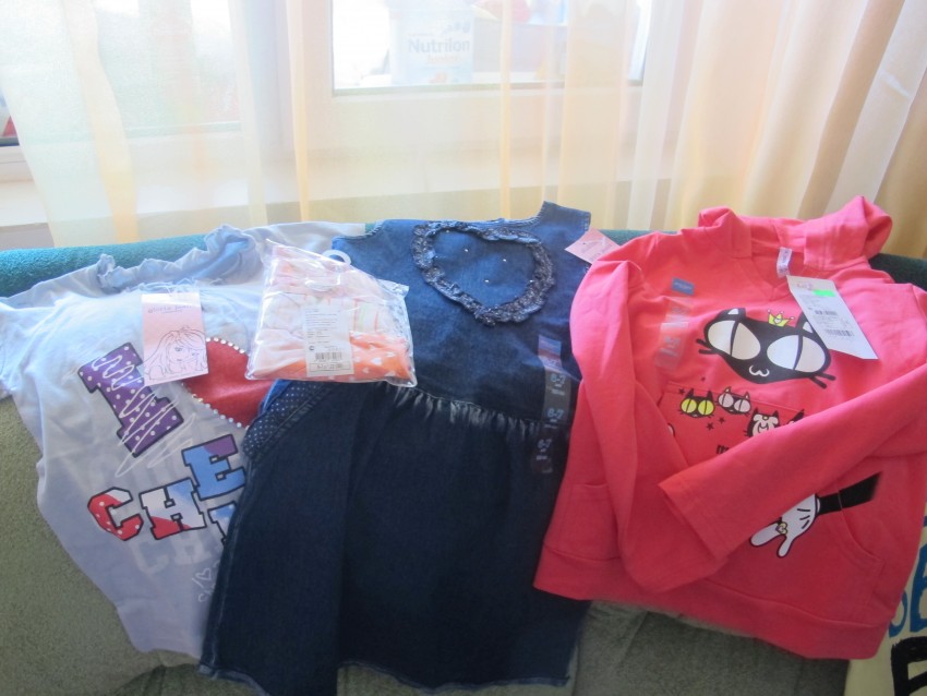 Так же собрала много детских вещей на маленькую Катюшу — платья и обувь. На старшего Ярослава пришлось купить, потому как для него ничего не оказалось, и так же на Снежанну. Передали еще посылку добра — немного еды и мыльные принадлежности Спасибо большое!