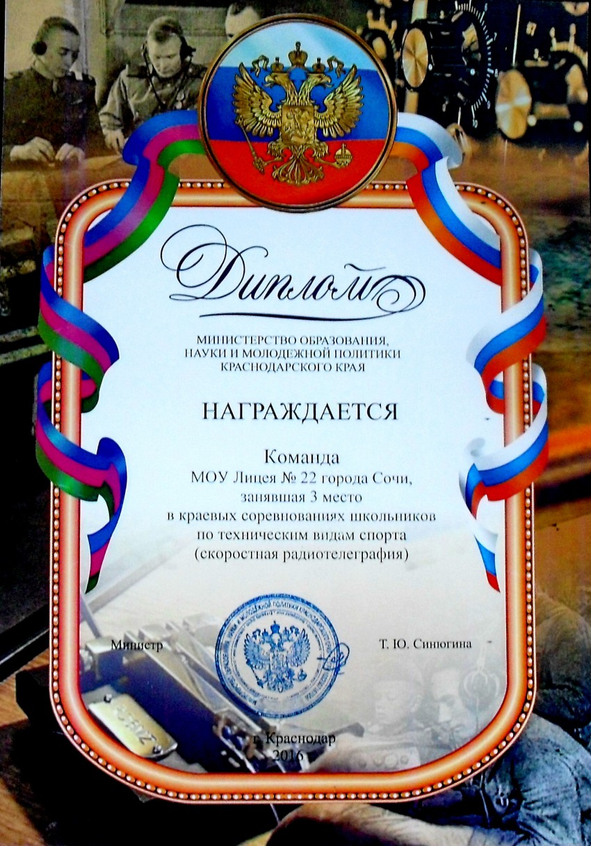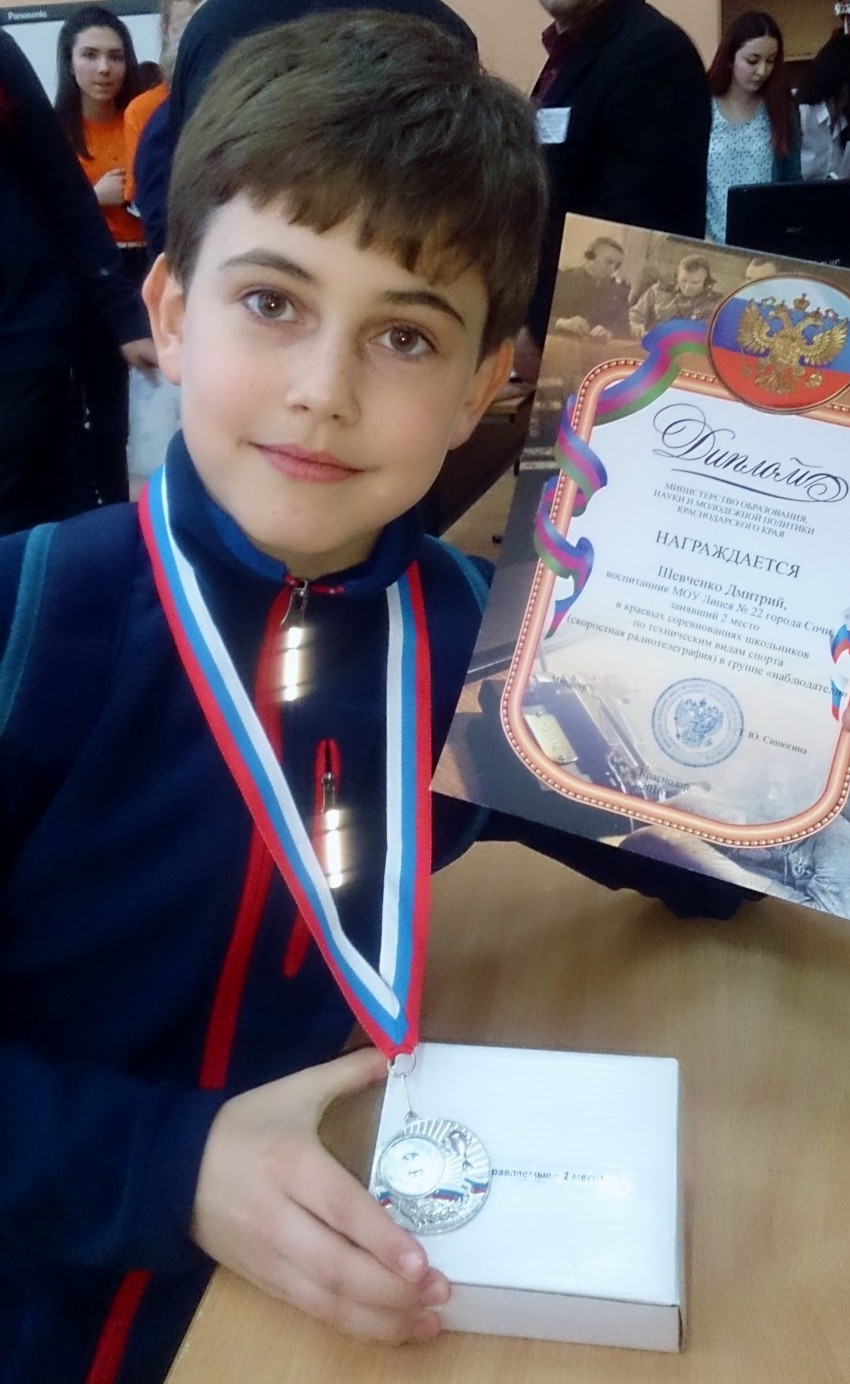 9 декабря 2016 года в городе Краснодаре состоялся чемпионат края по СРТ ( скоростной радиотелеграф). Наш город Сочи представляли две молодёжные команды: команда СЮТ (станция юных техников) отделение «Радиосвязь» в составе 5 человек- Н.Боталов, К.Вертипрахова, В.Шолтыс, Т. Двалишвили, А.Диданов, вторая команда лицея № 22 г. Сочи в составе 6 человек — Е.Тютюнников, Д.Шевченко, В.Савинков, М.Дургарян, М.Семенищев, И.Кахниашвили. В результате соревнований наша команда СЮТ завоевала 2 место — став серебряным призёром, а команда лицея 3 место- став бронзовым призёром, немного уступив краснодарцам. Но спорт есть спорт. Хочется отметить ученика 22 лицея Шевченко Дмитрия, который в личном зачёте завоевал 2 место, выполнив 2 взрослый разряд по радиоспорту. Наши ребятишки уже не первый раз участвуют в подобных соревнованиях, за что им большое наше ветеранское спасибо. Растёт достойная смена связистов.
