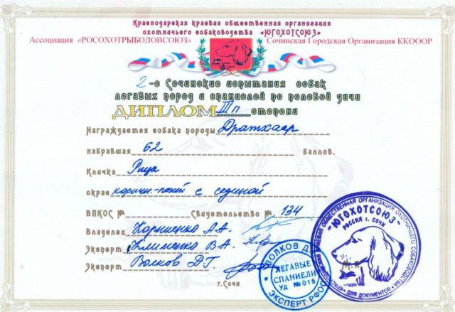 У Рицы неплохая родословная. Собака рабочая. В возрасте 9 месяцев получила диплом 3-й степени по перепелу. Тогда же из-за короткой шерсти и отсутствия бровей и оброслости на ушах и слабой бородки её экстерьер оценили всего навсего на «Удовлетворительно». Поэтому я её больше нигде не выставлял. Я её из всего помёта выбрал потому, что уверен: для наших южных условий длинная шерсть — лишнее, а слишком короткая мешает передвигаться в колючках Длина шерсти Рицы — оптимальная. Фото: