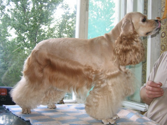 Пару-другую дней назад, проезжая мимо Спутника, видела у магазина на остановке привязанного к перилам американского кокера. Недавно подстрижен, а-ля салон «кривые ручки» — бритая голова, бритая спина, юбочка оставлена. Не крупная, палевая собака, показалось вроде сука… ибо как размера не большого для породы.