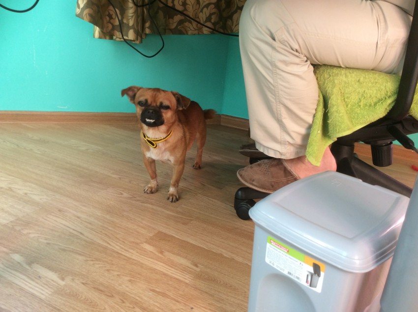 Я могу ошибаться, но пёсик очень похож на того, который живёт на Советской через дорогу от банка Российский Капитал. Того выпускают на самовыгул, а он потом приходит к подъезду и громко лает, пока его не впустят хозяева.