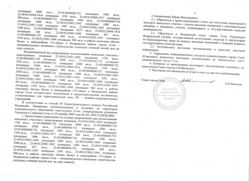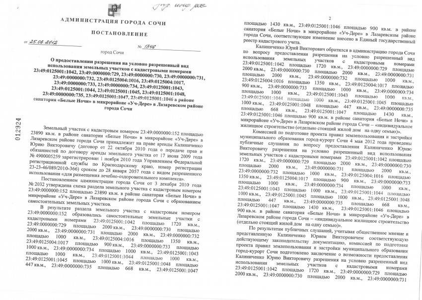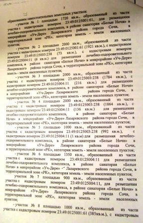 Путем очередной переуступки прав о передаче прав и обязанностей по договору аренды арендатором земельного участка площадью 23890 кв.м. стал гражданин Калиниченко Ю. В., которому захотелось изменить вид земельного участка в районе санатория «Белые Ночи», в микрорайоне Уч-Дере» в Лазаревском районе города Сочи с кадастровыми номерами:
