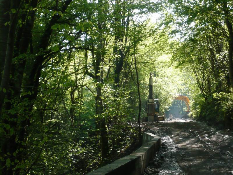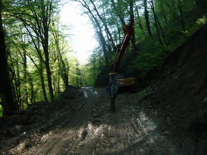 Сразу за домом Кошмана стоит КПП, через который пропускают только грузовики на стройку дороги. Мы шли с тяжёлыми рюкзаками. Долго беседовали с охранником КПП, объясняли ему, что здесь проходит популярный туристический маршрут. В конце-концов охранник сказал: «ну ладно, я вас не видел и вы меня не видели». Пошли мы дальше, грязища ужасная, носятся камазы, бульдозеры, гастарбайтеры вяжут арматуру. Спускаемся к реке Бзыч. Тут стоит КПП заповедника (на левом берегу р. Бзыч). Мы все в грязище в этой, подходим к представителю заповедника — а тот говорит: возвращайтесь откуда пришли, я вас даже через реку не пущу. Я говорю: «вы издеваетесь. Мы уже больше часа шагаем по этой грязище, матеря эту стройку, все нервы себе вытрепали, в поход, называется, пошли. А вы теперь хотите чтобы мы обратно попёрли, с рюкзаками, и это после месячной подготовки?» Короче, никак этот представитель заповедника нас не хотел пускать.