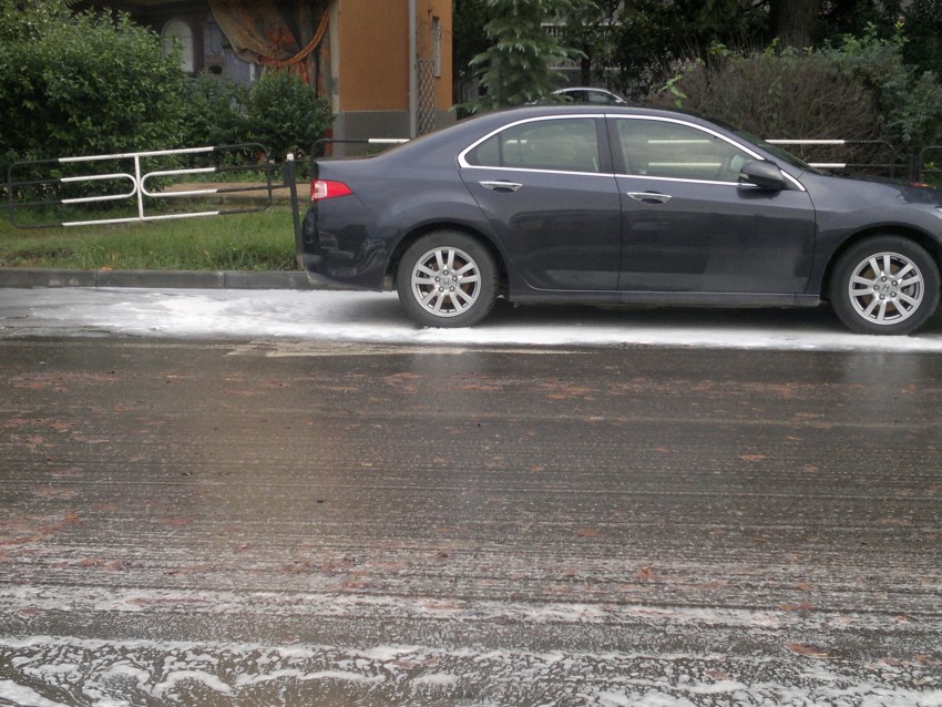 Машина на фото моя. Подхожу в багажник груз положить и чувствую что-то мои замшевые тупли промокли. А уже темно было. Смотрю вниз — ну собственно пена непонятно от куда взявшаяся. Думаю понятно что я шепотом озвучил о городе, стройке, олимпиаде и т.д… :)