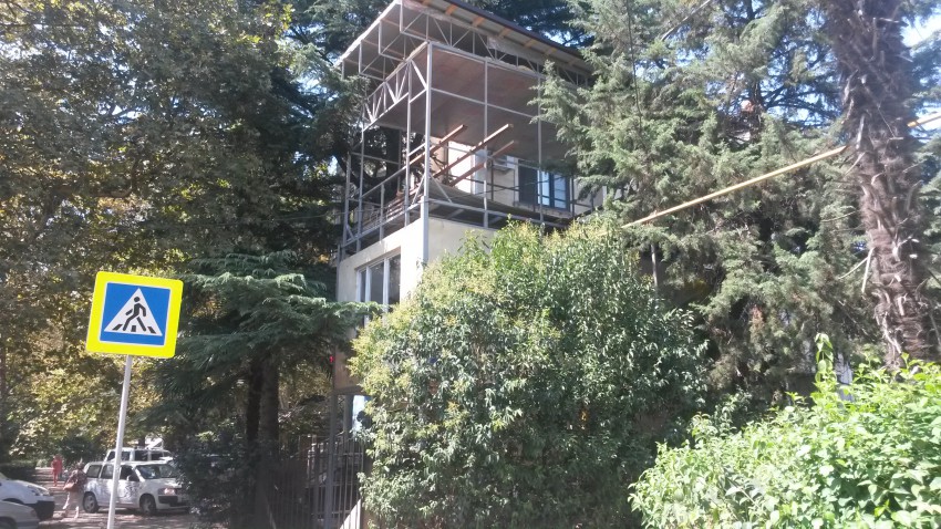 А теперь — к неприятным мелочам. Итак, домик, на самом деле, не на дереве, как написано в заголовке, а В дереве. В роскошной кроне кедра на улице Новосёлов. Ранние этапы строительства уже были представлены на ПриветСочи. Для возведения третьего этажа городу в угоду неизвестному лицу пришлось пожертвовать роскошной кедровой ветвью, но теперь гаражный домик уютно вписался в природную среду на радость хозяину.