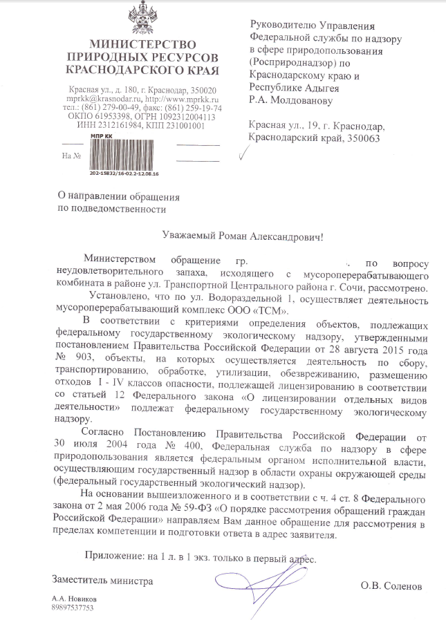 ресурсов Краснодарского края (исх. 202-15832/16-02.2-12/08.16) Управление