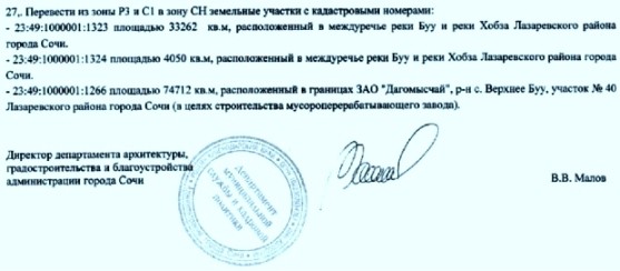 Принято решение поддержать подготовку Постановления Правительства РФ, распространяющего льготный «зеленый тариф» на проект по созданию завода по термической переработке отходов в Сочи. В соответствии с поручением Президента России Постановление должно выйти не позднее 1 апреля текущего года. Администрации курорта предписано произвести отбор земельного участка, соответствующего требованиям природоохранного законодательства, для строительства завода и провести публичные слушания по проекту строительства.