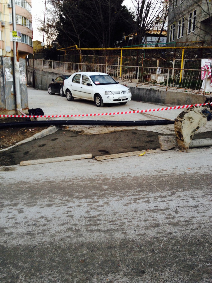 На прошлой неделе был первый подарок — залили бетоном траншею, которая вела во двор Клубничной, 32. Предлагаю Вам оценить размеры и представить как тяжко было заезжать. Мой сосед оставил в первый же день обвес.
