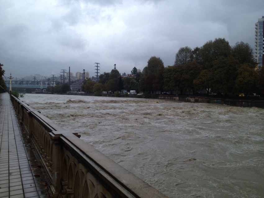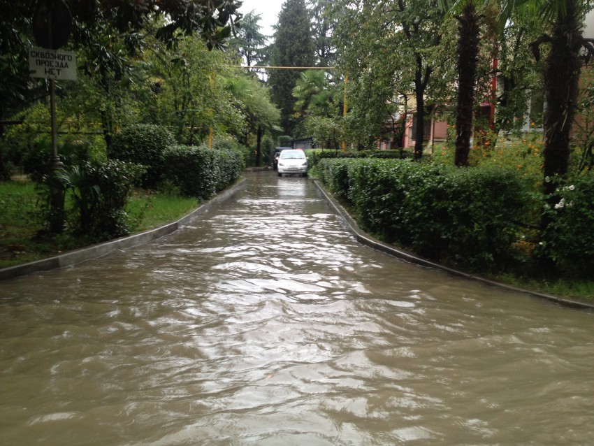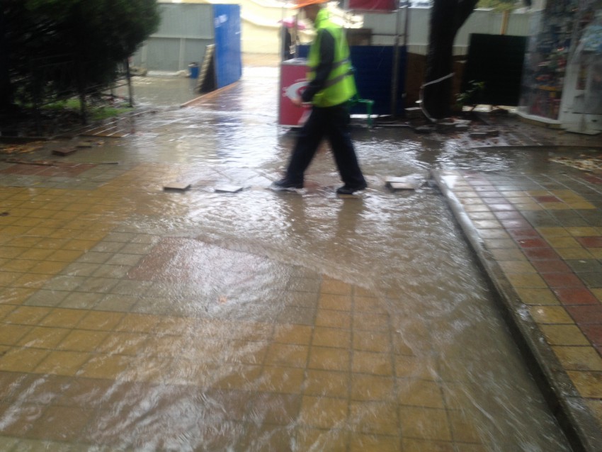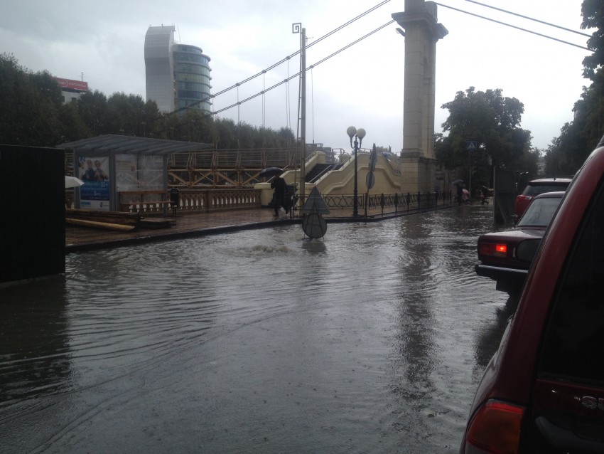 В какое время снимали? Я шла где-то в половину третьего, воды было меньше, но она действительно не уходила в ливневку, а наоборот лилась от туда. В общем, резиновые сапоги — наше все:)))