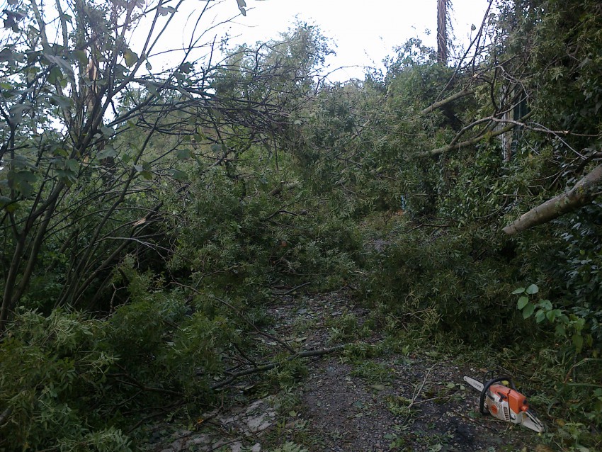 4. В сентябре 2013 года наша улица попала под раздачу ураганного ветра. Как раз в этом месте упал огромный дуб. МЧСники его пилили, так-как он был слишком толстый и тяжелый для моей пилы. У многих деревьев снесло кроны, остались только стволы. Стволы стали подсыхать и загнили. Возможно это тоже внесло свой вклад, так-как известно, что деревья регулируют уровень грунтовых вод. Вот фото улицы как раз напротив оползня: