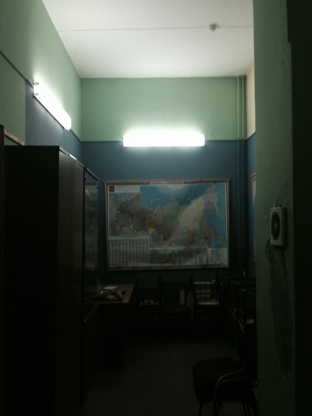 До нас в этом помещении базировался театральный кружок, поэтому стены обшиты панелями и сделан навесной потолок. Также там установлена мини сцена. Все это легко демонтируется.