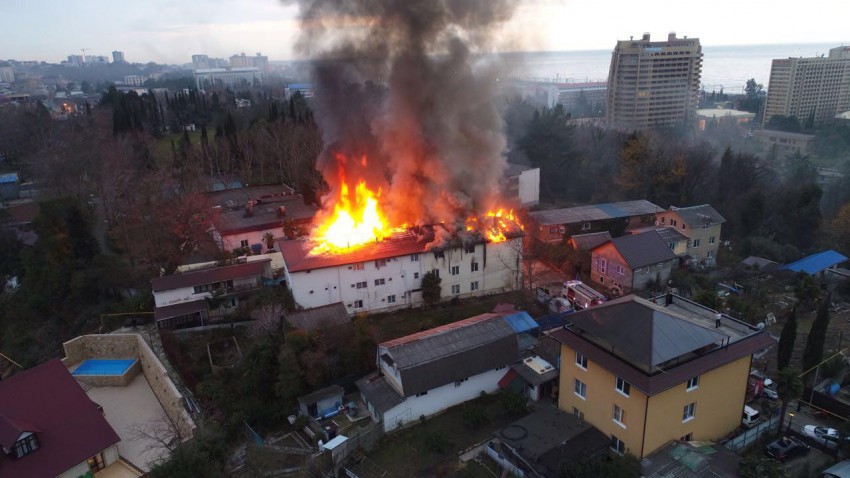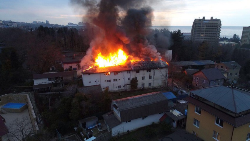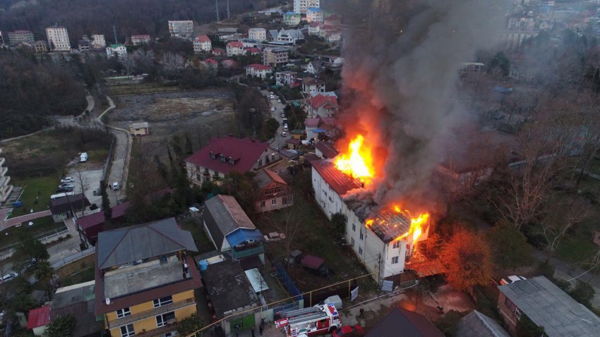 Прислала Дарья: Пожар в Адлере сейчас. Частный отель возле санатория «Известия». По словам очевидцев пожар перекинулся на соседний дом.