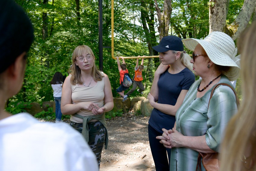 Далее дети с сопровождающими остались на пикник, а старшие представители группы прогулялись по части лечебной пешеходной тропы до смотровой площадки, где открывается вид на главный Кавказский хребет и на башню Ахун.